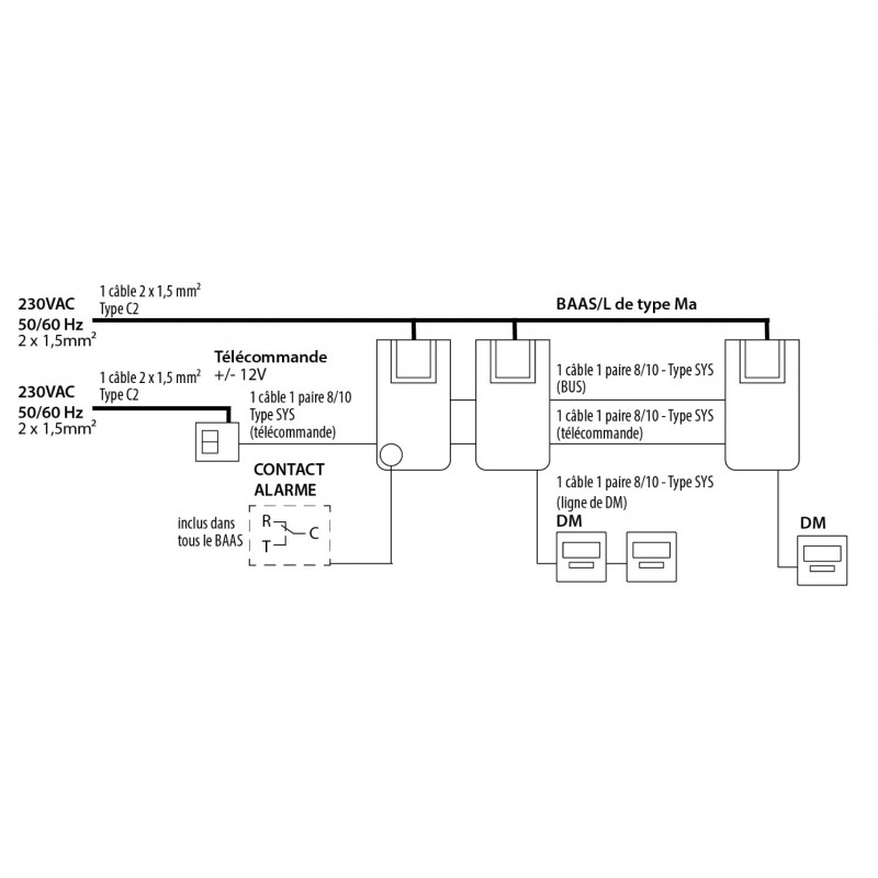 Ligne de BAAS | jusqu’à 1000 m (câble 1 paire 8/10e) ou 2000 m (câble 1,5 mm²) |