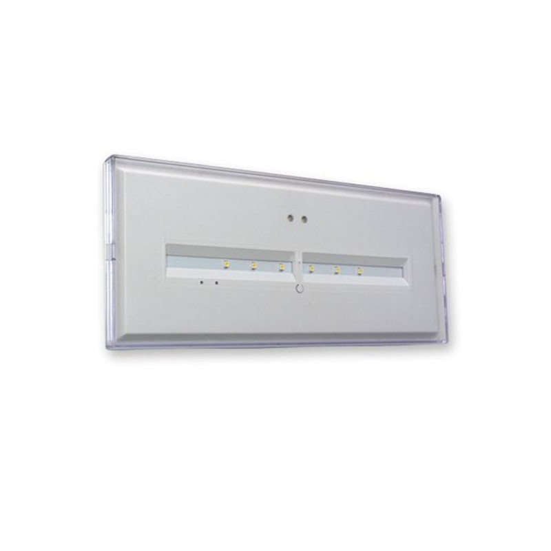 Son flux lumineux de 450 lumens assure une diffusion homogène pendant 1 heure d’autonomie. Avec une batterie Ni-Cd 4,8V - 1,6Ah, un indice IP42/IK04 et une enveloppe en polycarbonate blanc RAL9003, il offre fiabilité et robustesse.